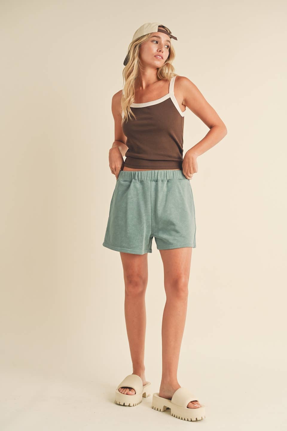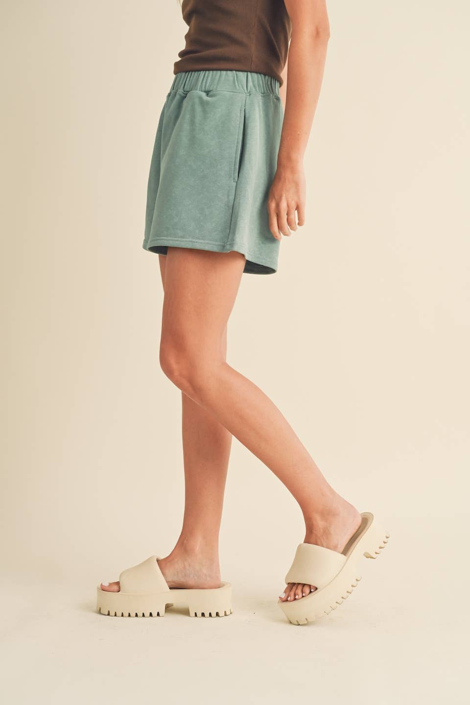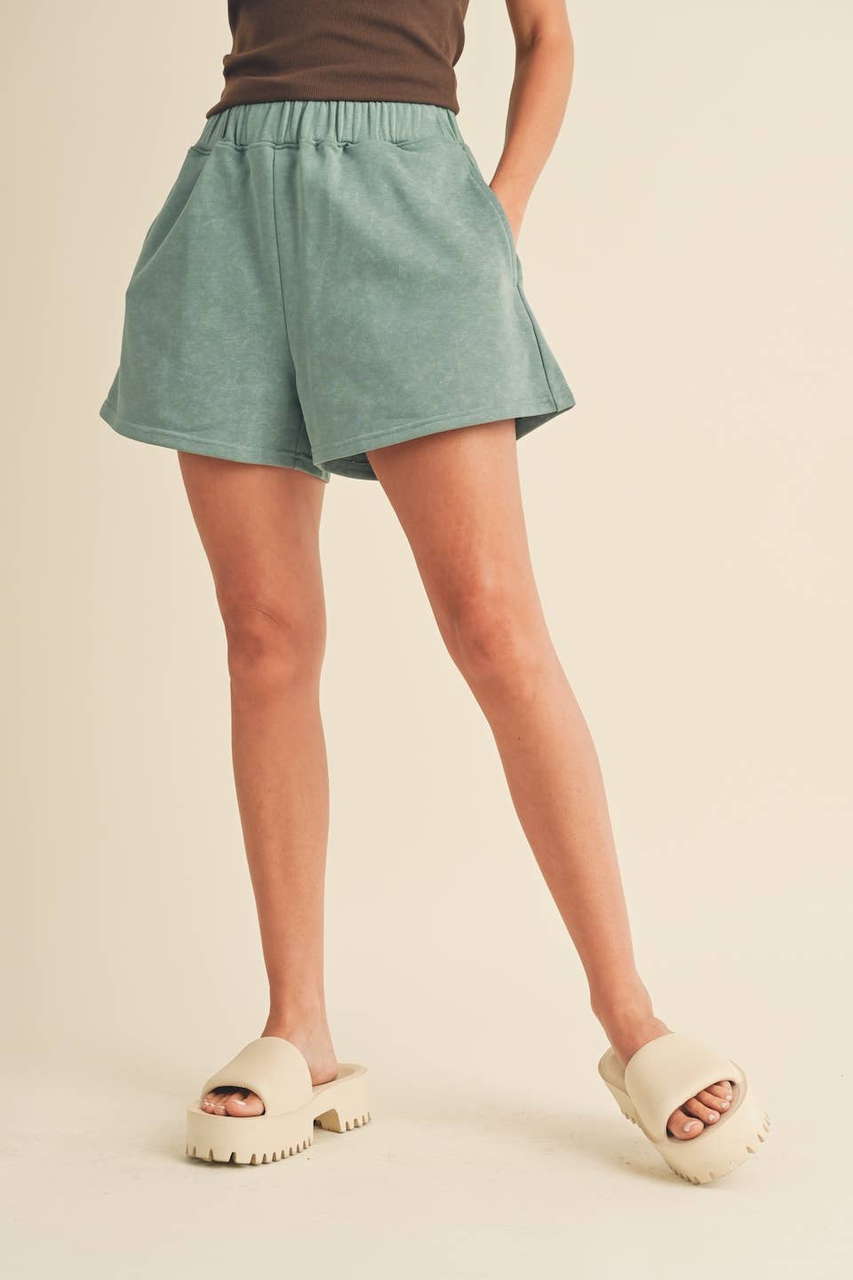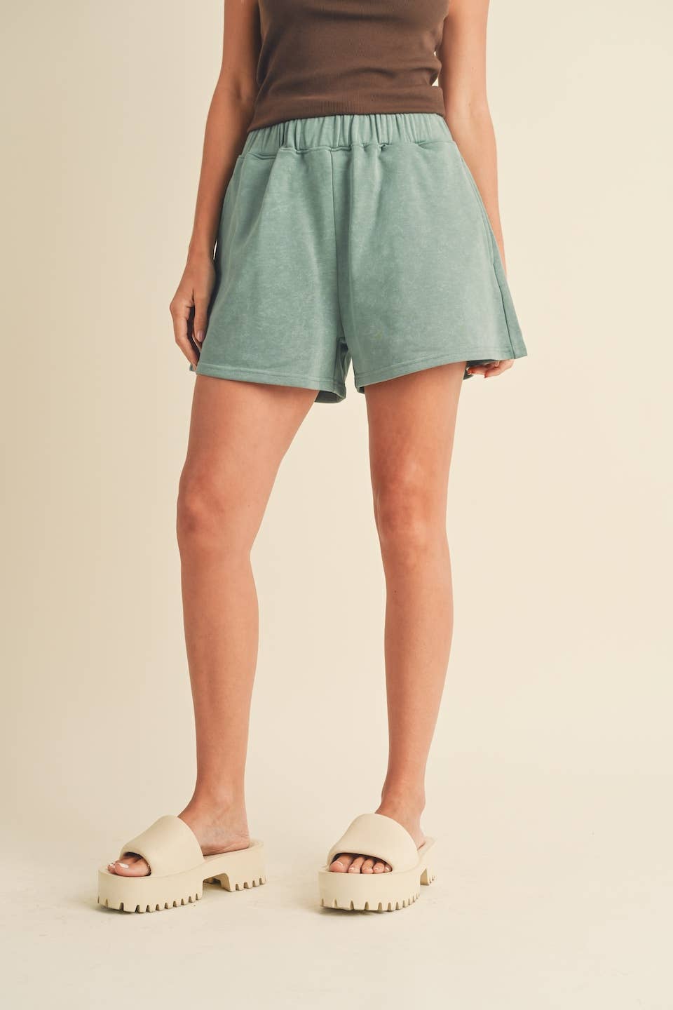 These sage green sweat shorts have an elastic waist and front pockets and fit true to size.