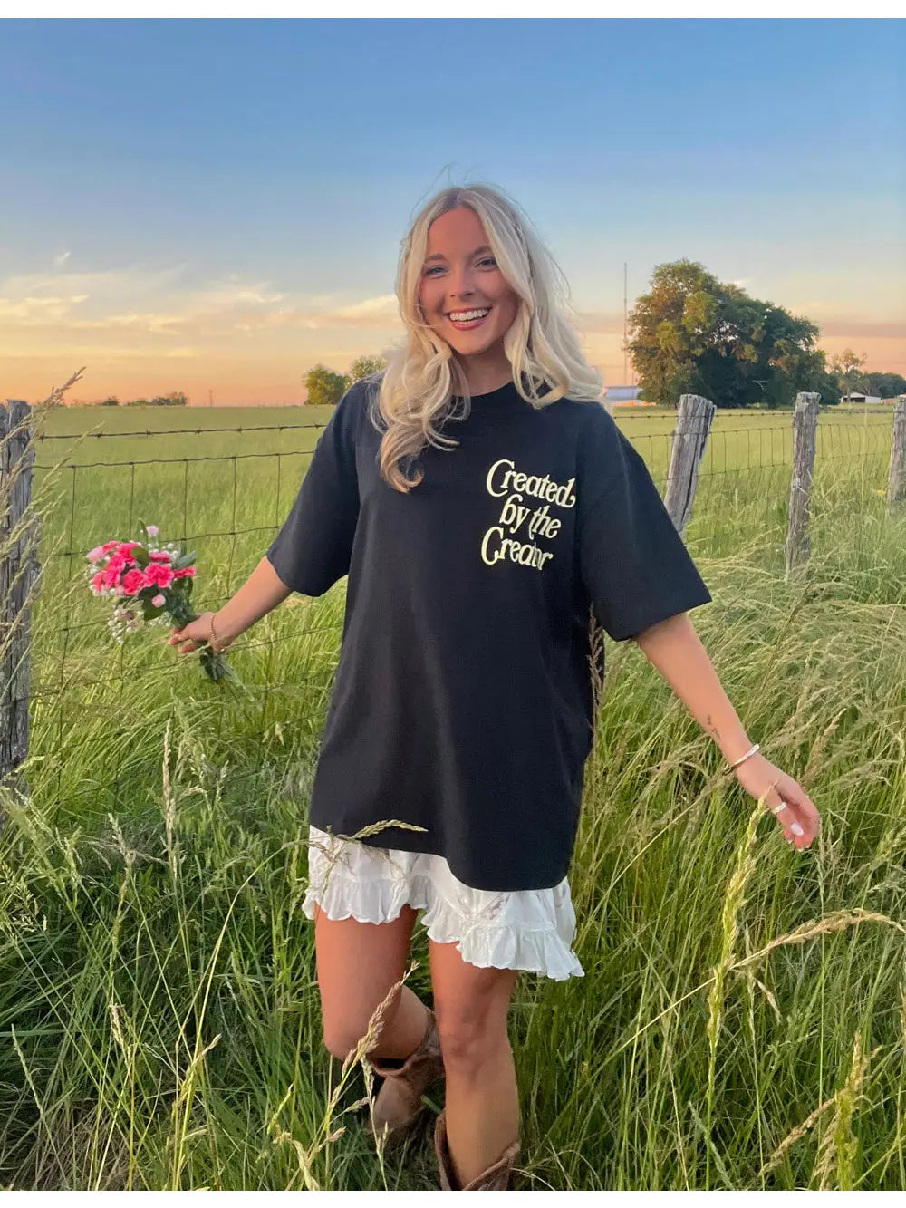 "For by him all things were created, in heaven and on earth, visible and invisible, whether thrones or dominions or rulers or authorities—all things were created through him and for him." -Colossians 1:16 Size: Model is 5'3" and wearing a size Large. Fit: Oversized, Unisex Fit Color: Black Composition: 100% Cotton Features: Super Soft, Pre-Shrunk