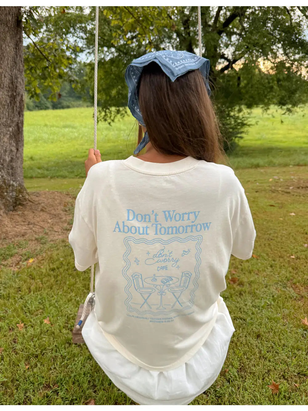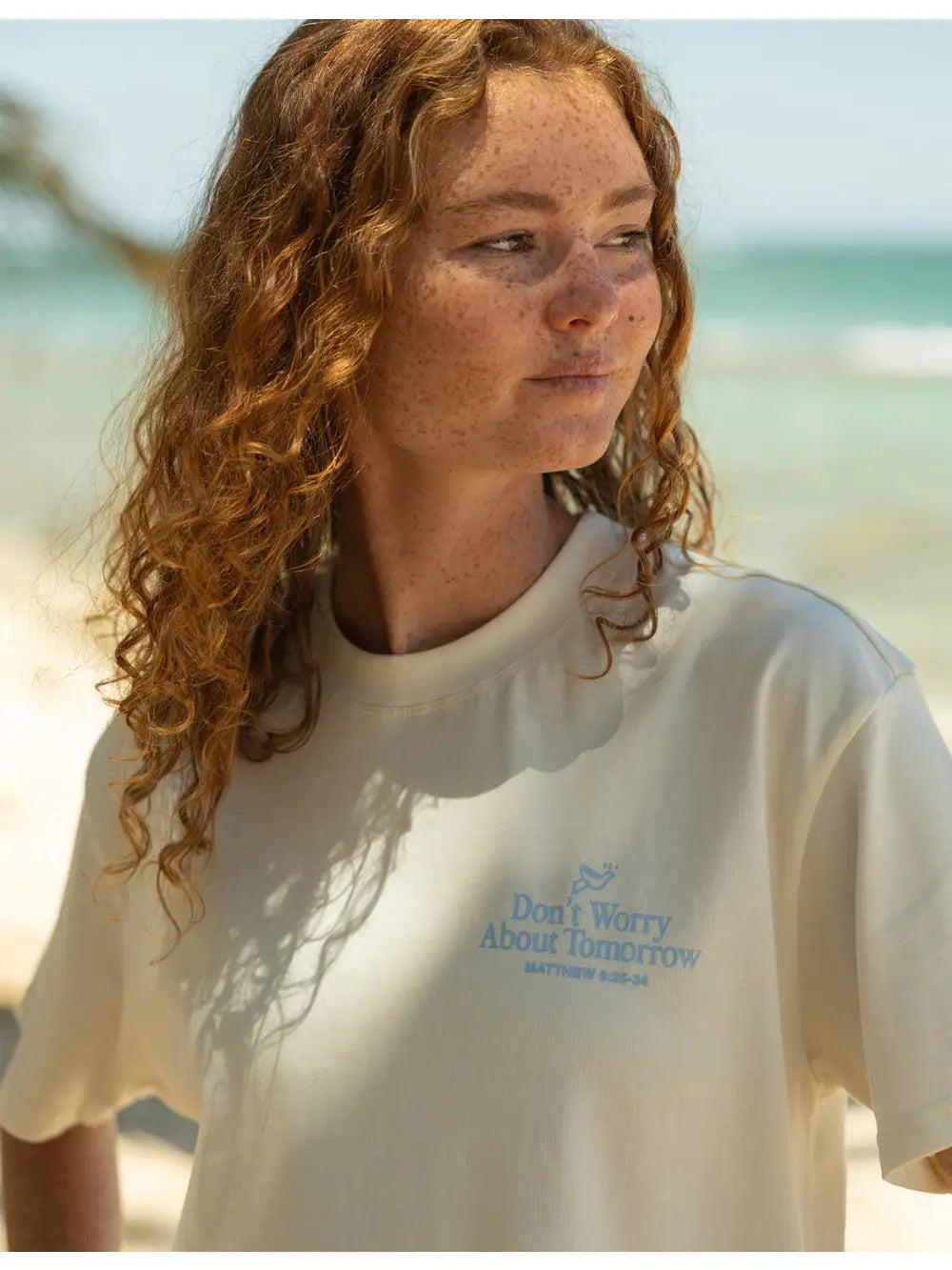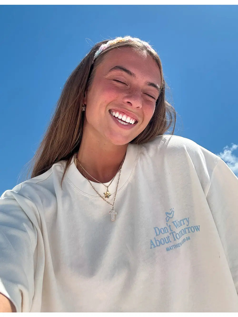 "Therefore I tell you, do not worry about your life, what you will eat or drink; or about your body, what you will wear. Is not life more than food, and the body more than clothes?" -Matthew 6:25 Size: Model is 5'8" and wearing a size Small. Fit: Oversized, Unisex Fit Color: White Down Composition: 100% Cotton Features: Super Soft, Pre-Shrunk