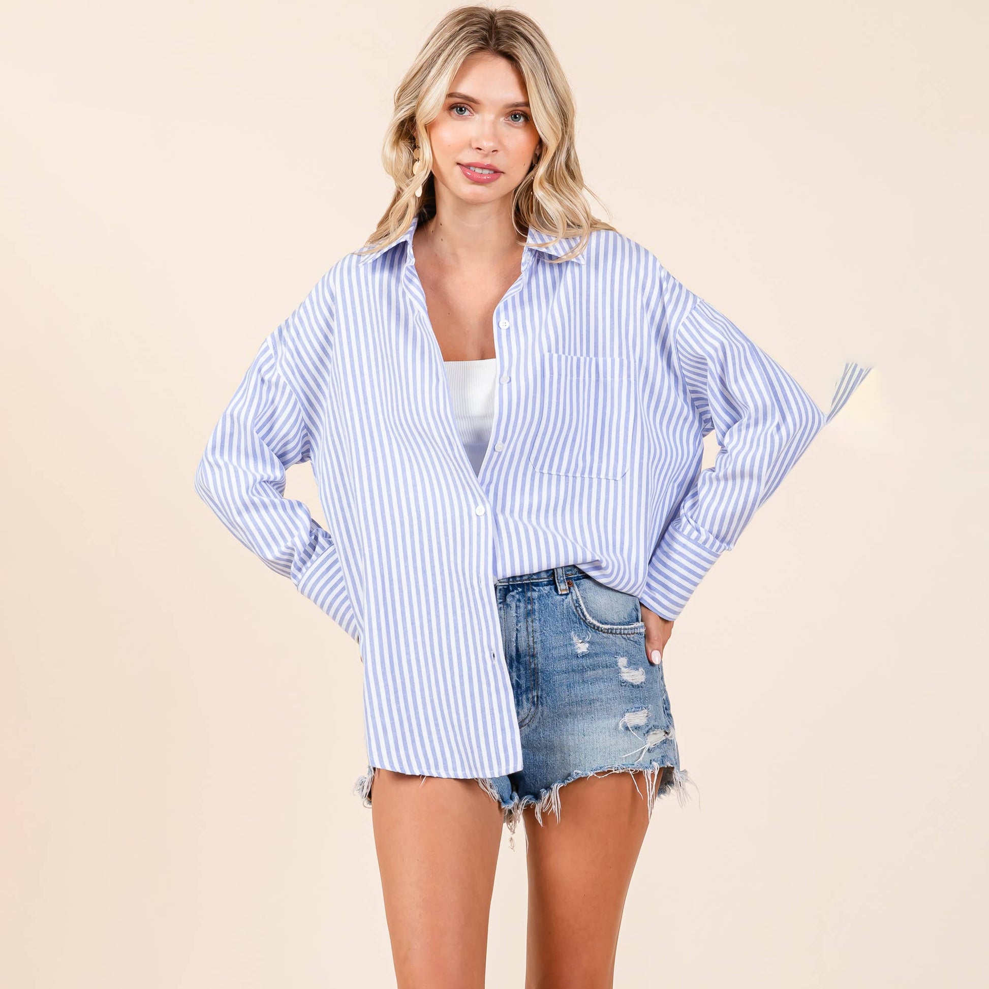 Features: Collared, Long Sleeve, Front Pocket, Striped, Button down, Oversized Model is 5.7"(34C 24 34) wearing small