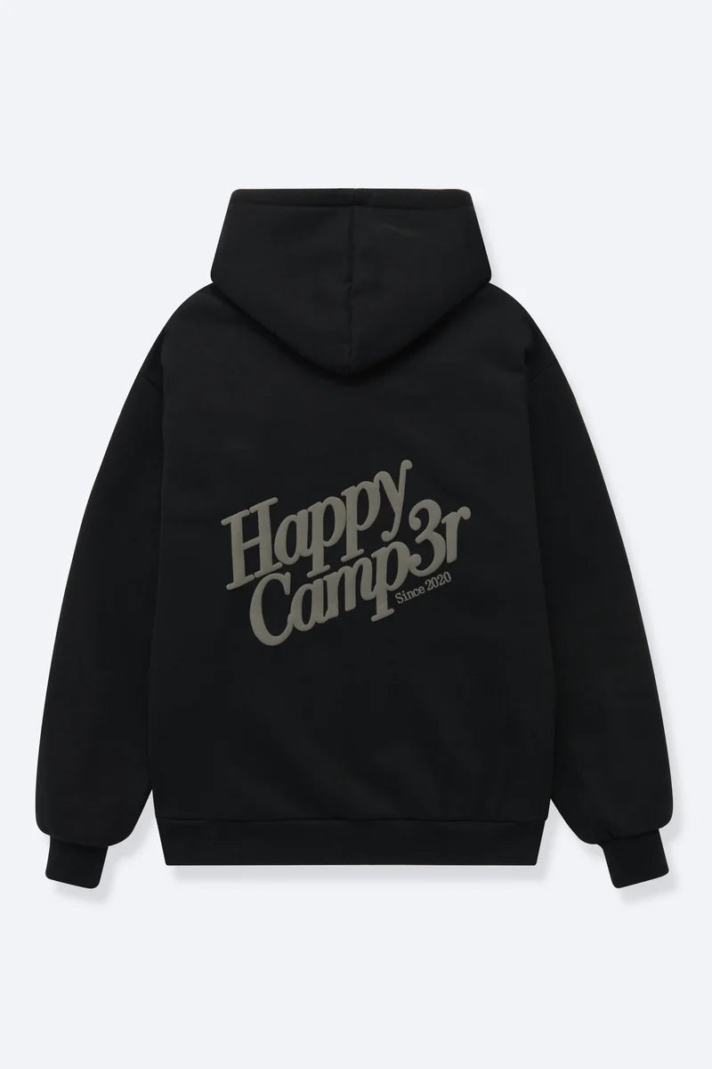 • Black fleece with thick black puff print "Happy Camp3r" on the front and "Happy Camp3r" on the back