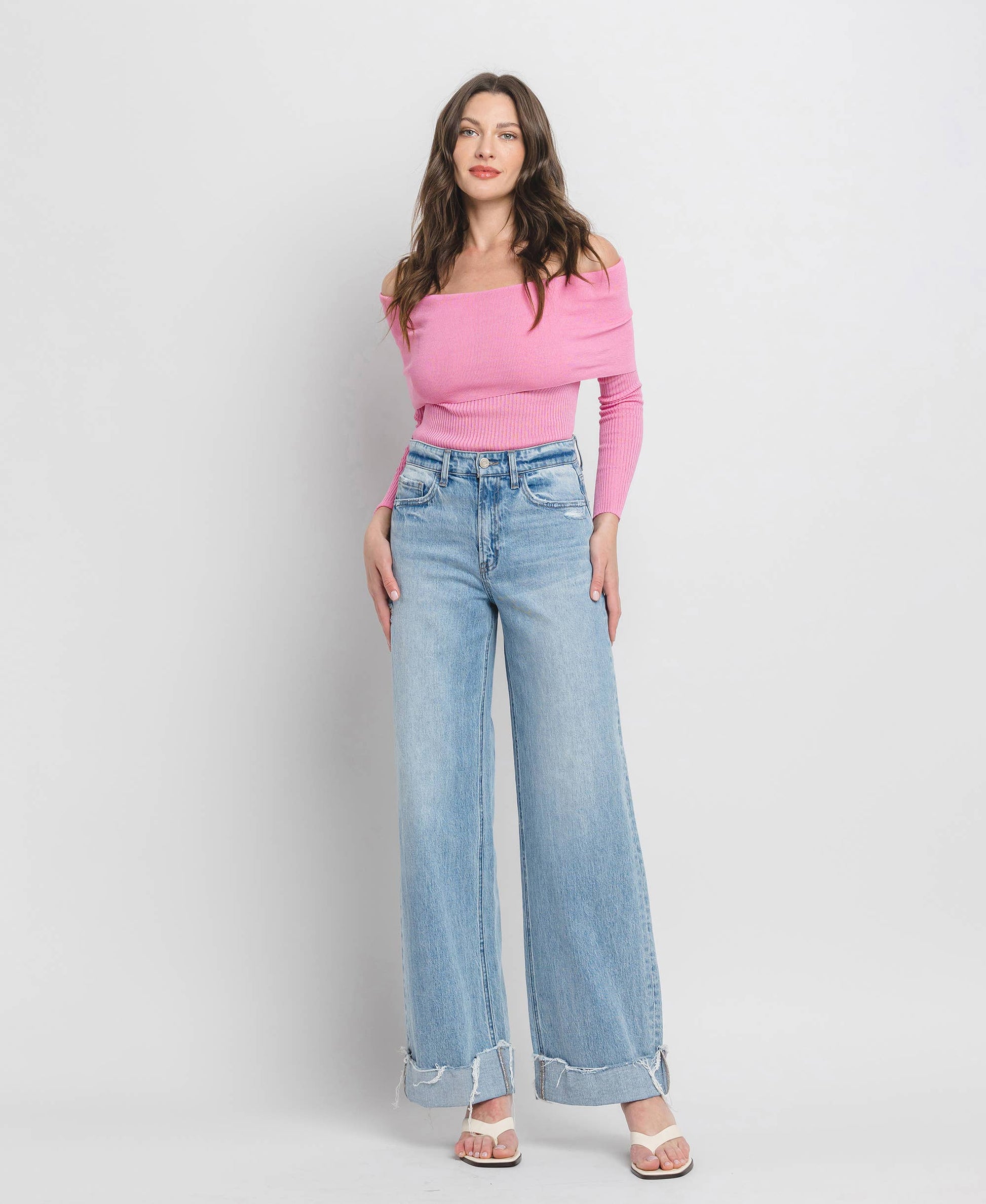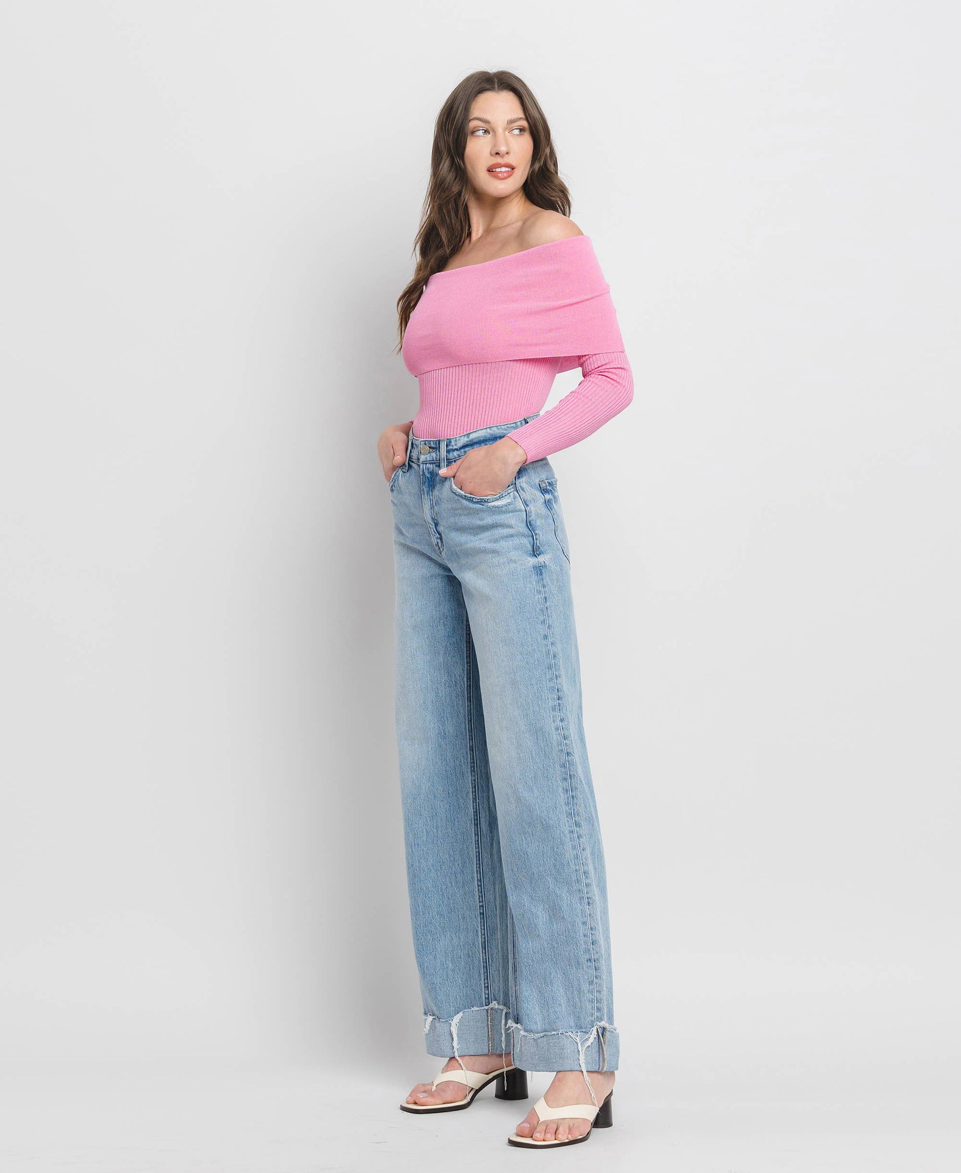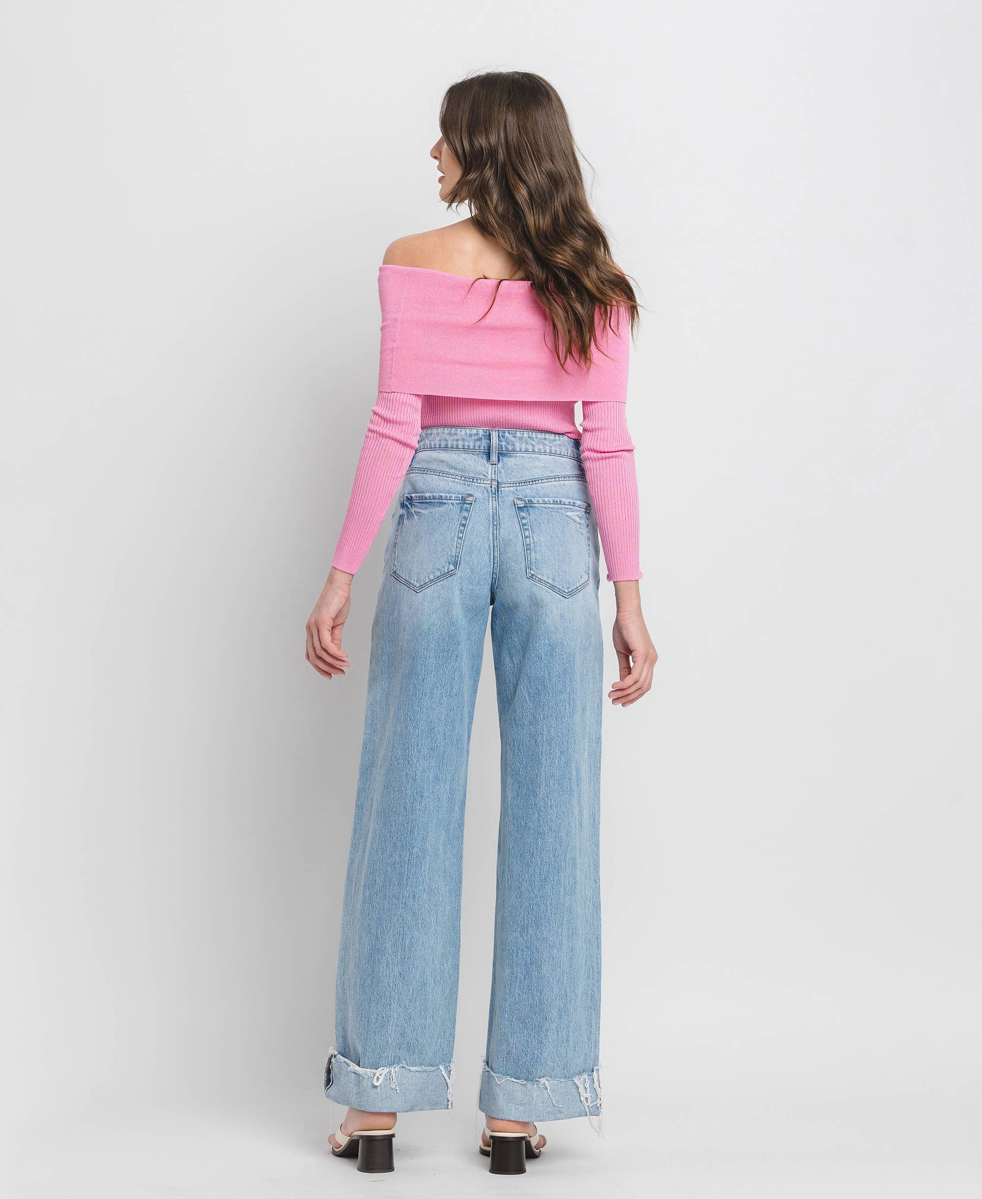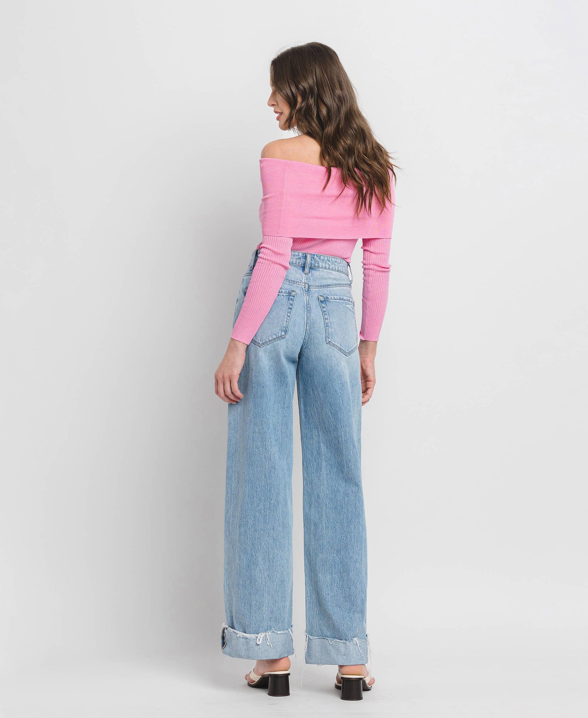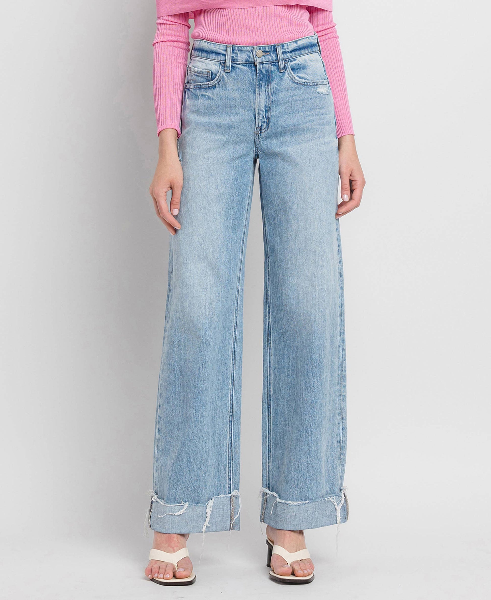 SUPER HIGH RISE CUFFED BAGGY WIDE LEG JEANS COMFORT STRETCH DENIM, SUPER HIGH RISE WAIST, SINGLE CUFF HEM, FULL LENGTH, BAGGY WIDE LEG JEANS F. RISE: 11" / INSEAM: 32" / LEG OPENING: 22" / CUFF: 3" X 1 MODEL IS 5'9" WEARING SIZE 26
