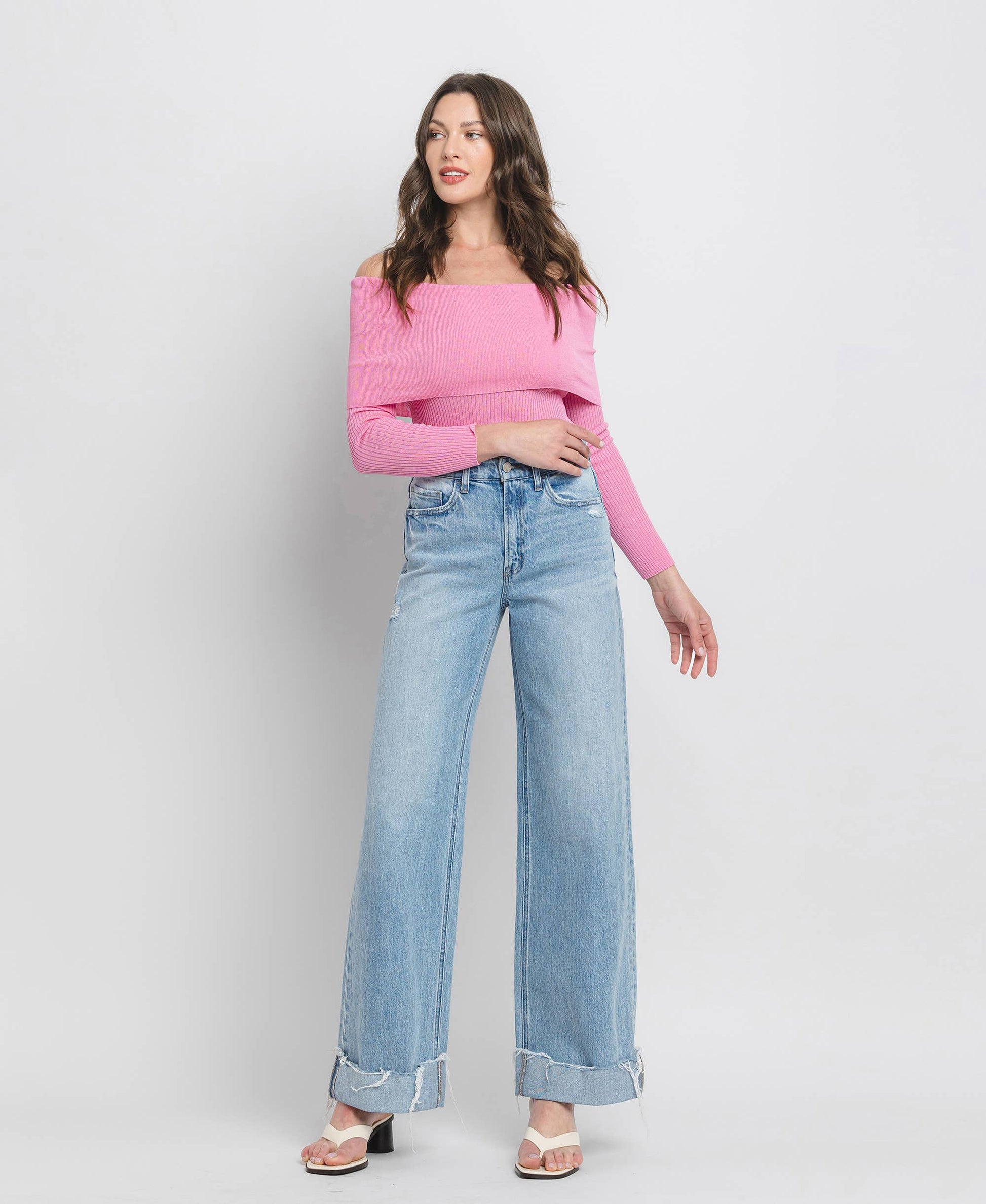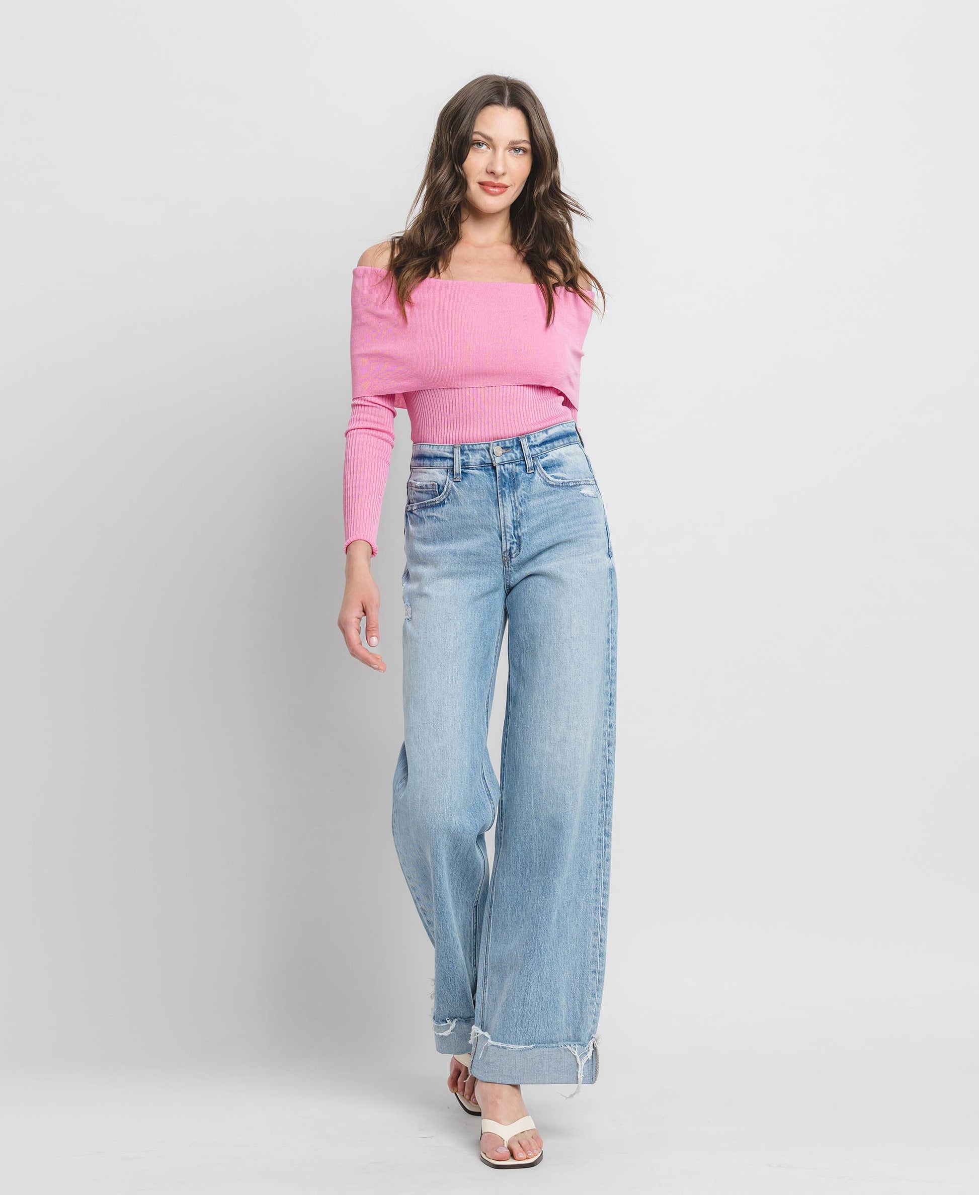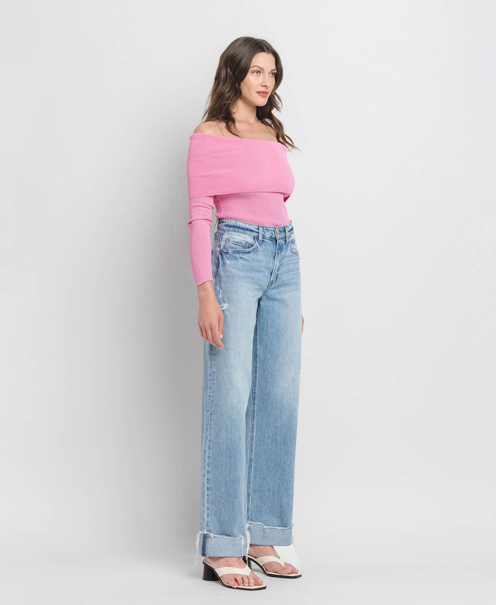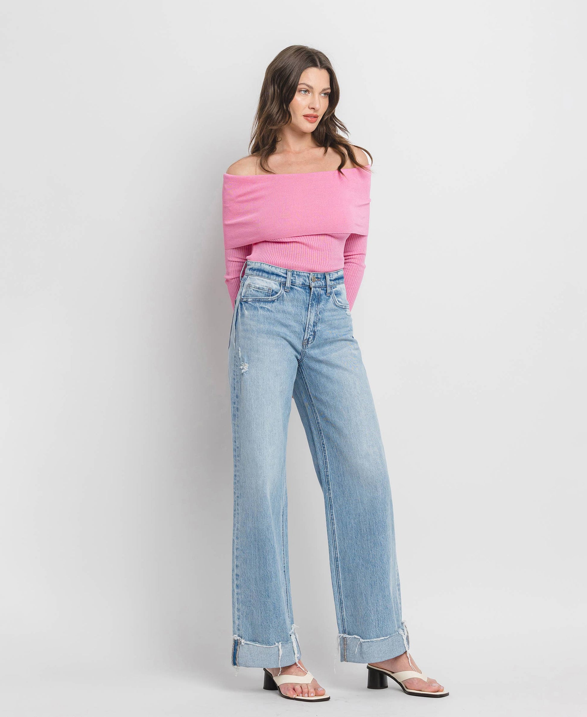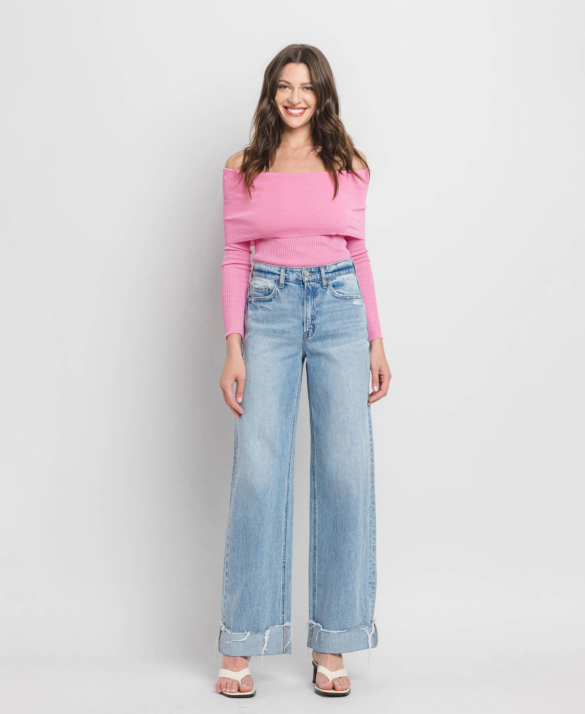 SUPER HIGH RISE CUFFED BAGGY WIDE LEG JEANS COMFORT STRETCH DENIM, SUPER HIGH RISE WAIST, SINGLE CUFF HEM, FULL LENGTH, BAGGY WIDE LEG JEANS F. RISE: 11" / INSEAM: 32" / LEG OPENING: 22" / CUFF: 3" X 1 MODEL IS 5'9" WEARING SIZE 26
