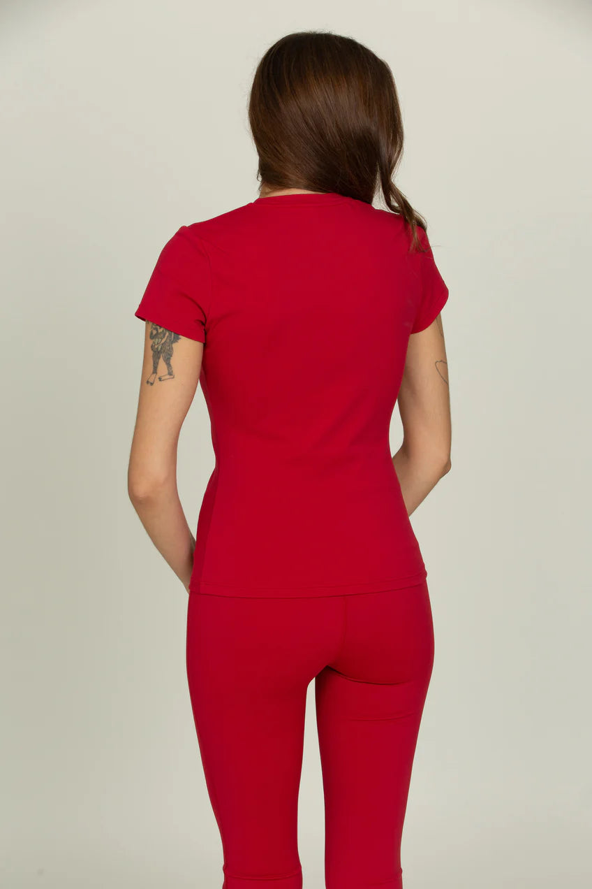 This Gold Hinge tee is a full-length tee in the color Ruby.