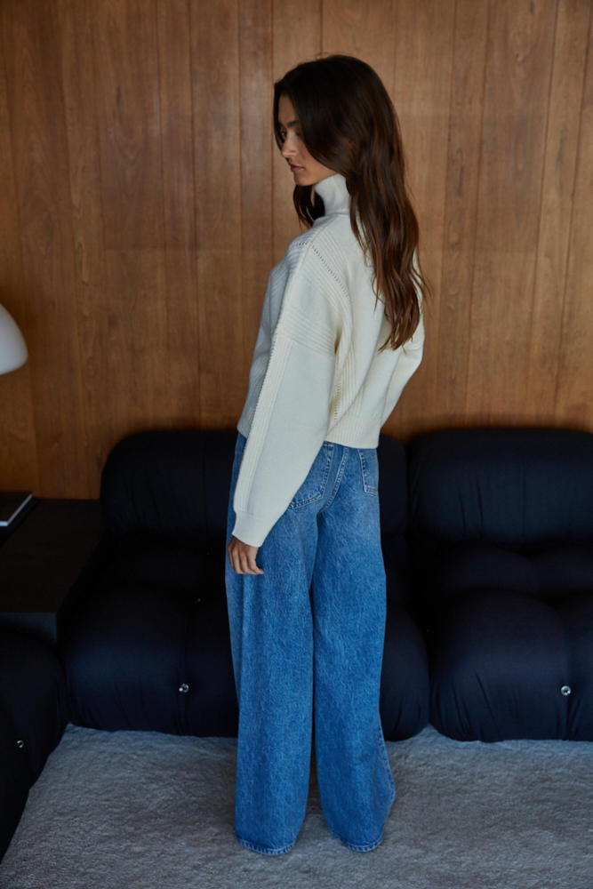 This classic Turtle neck sweater is a beautiful ivory color with some beautiful cable knit detailing without.  Looking for the perfect piece to layer all fall and winter......THIS IS IT!